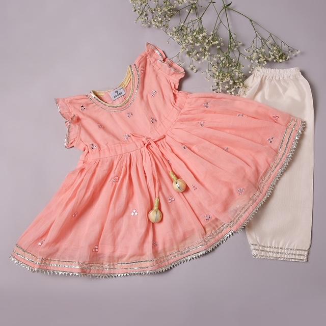 PEACH ANARKALI WITH MIRROR WORK AND IVORY PANTS