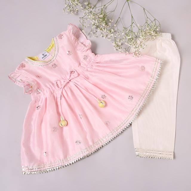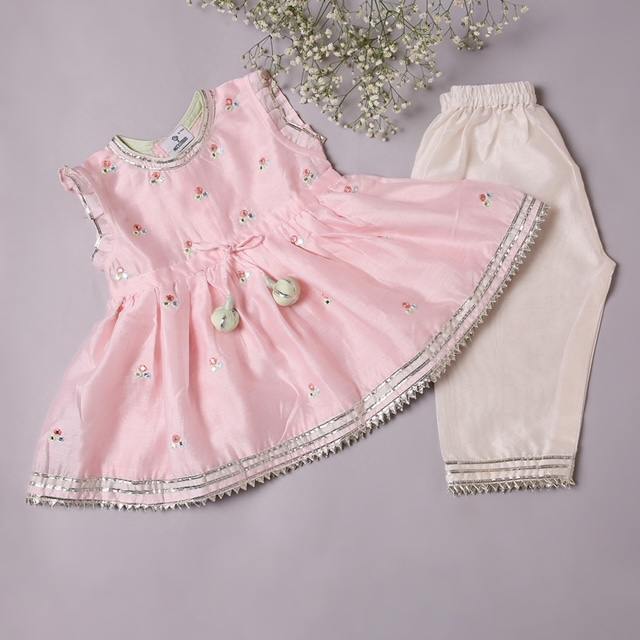 BABY PINK ANARKALI WITH MIRROR AND RESHAM WORK AND IVORY PANTS