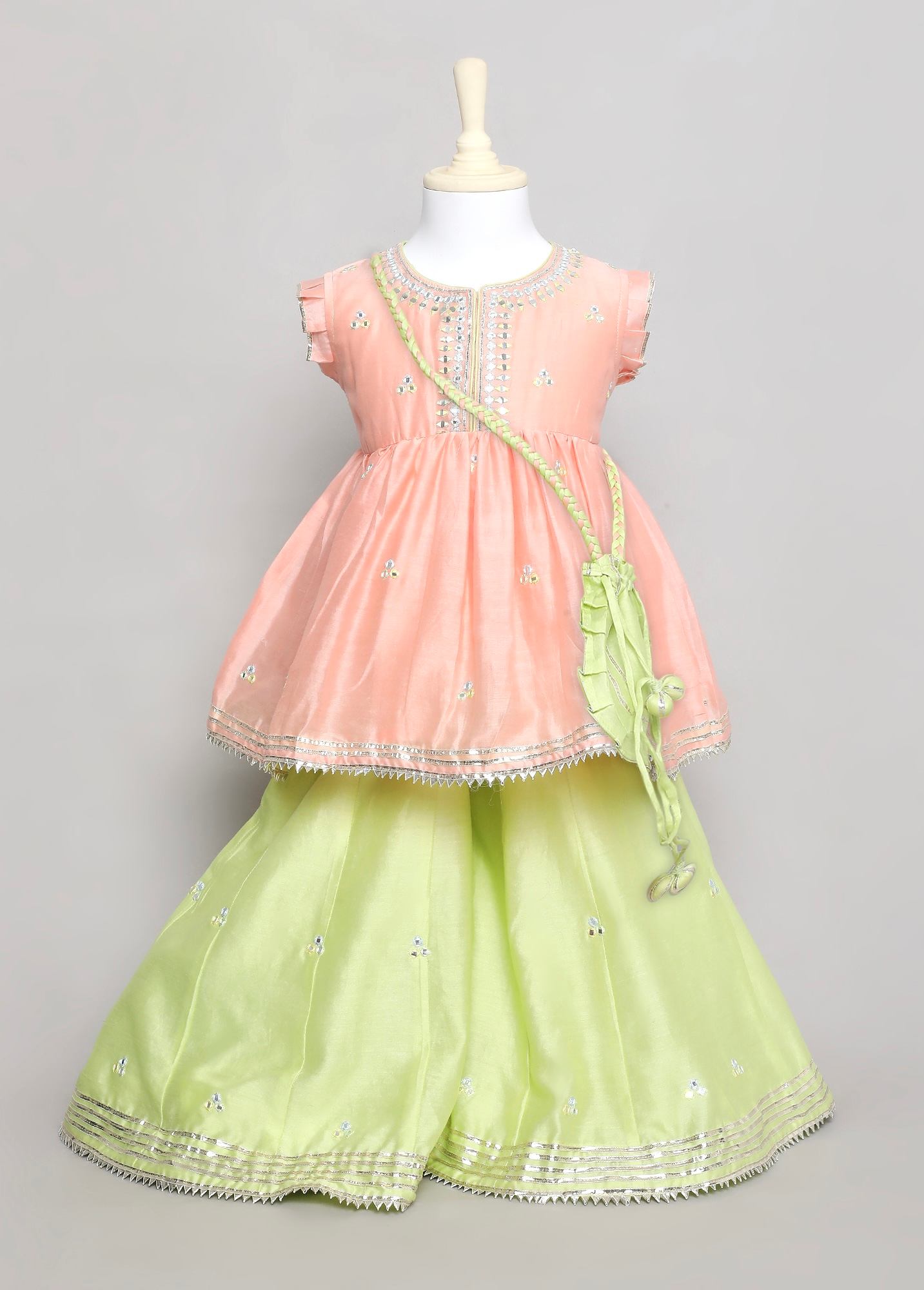 Peach Peplum with Green Gharara with Mirror, Gota and Resham Work with Green Potli Bag
