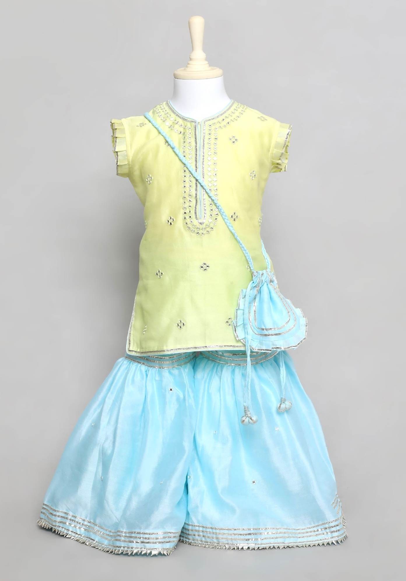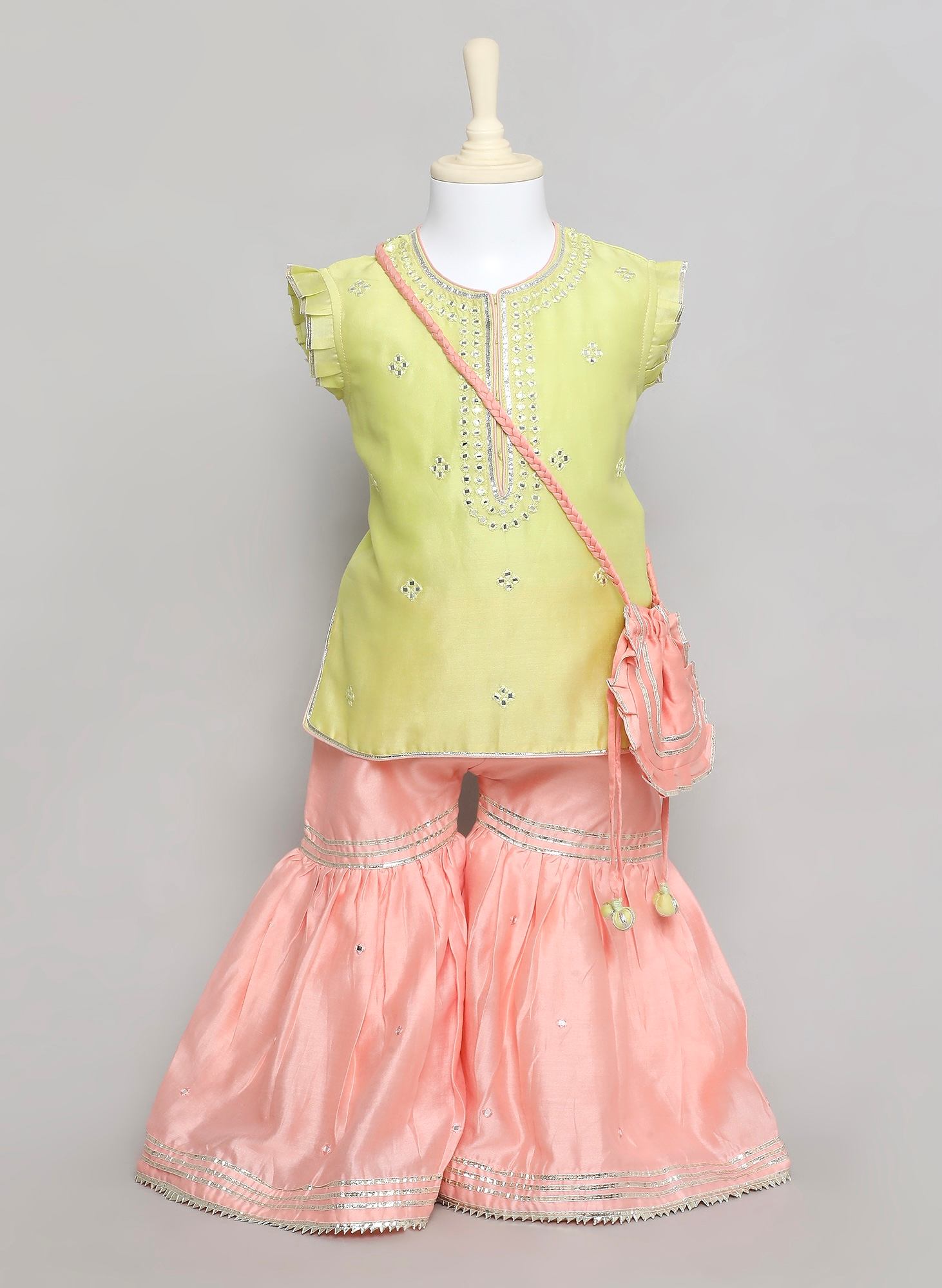 Green Kurta with Mirror Work and Coral Gharara with Coral Potli Bag
