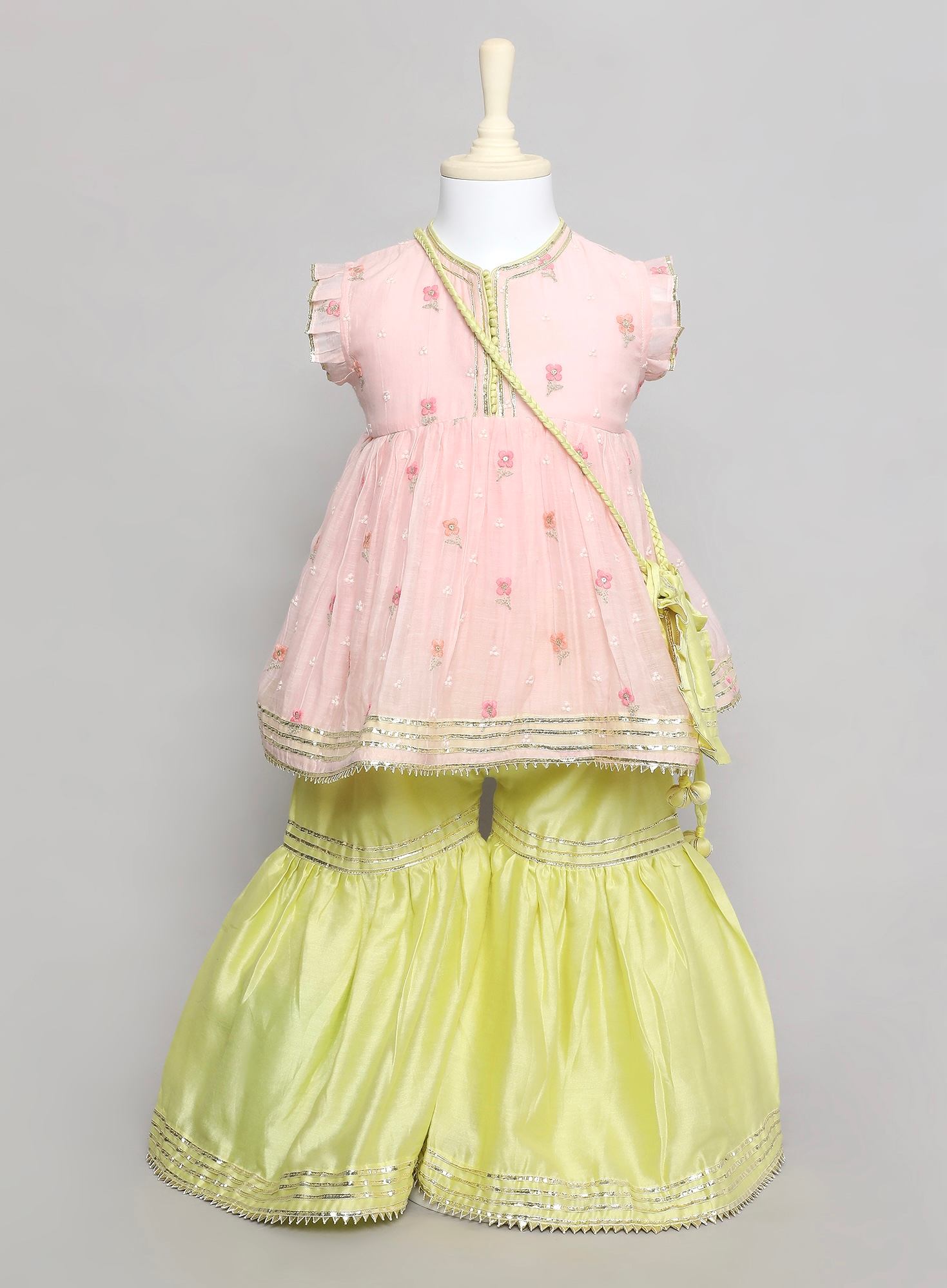 Pink Chanderi Peplum Top with Thread Work and Green Gharrara and Green Potli Bag