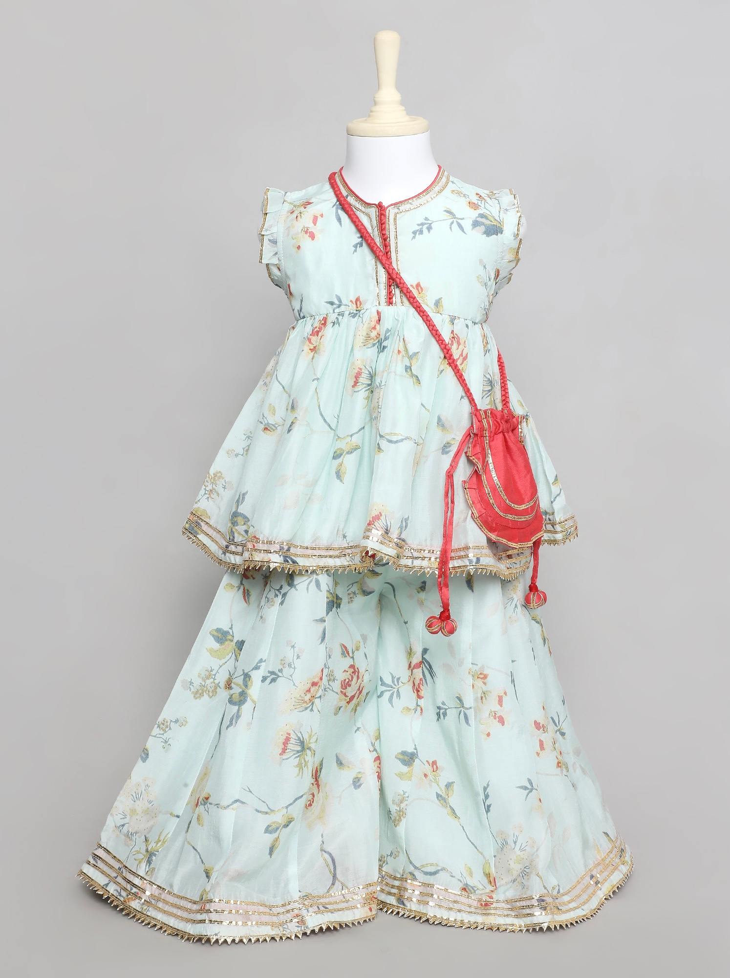 Blue Printed Peplum Top with Gharara and Coral Potli Bag