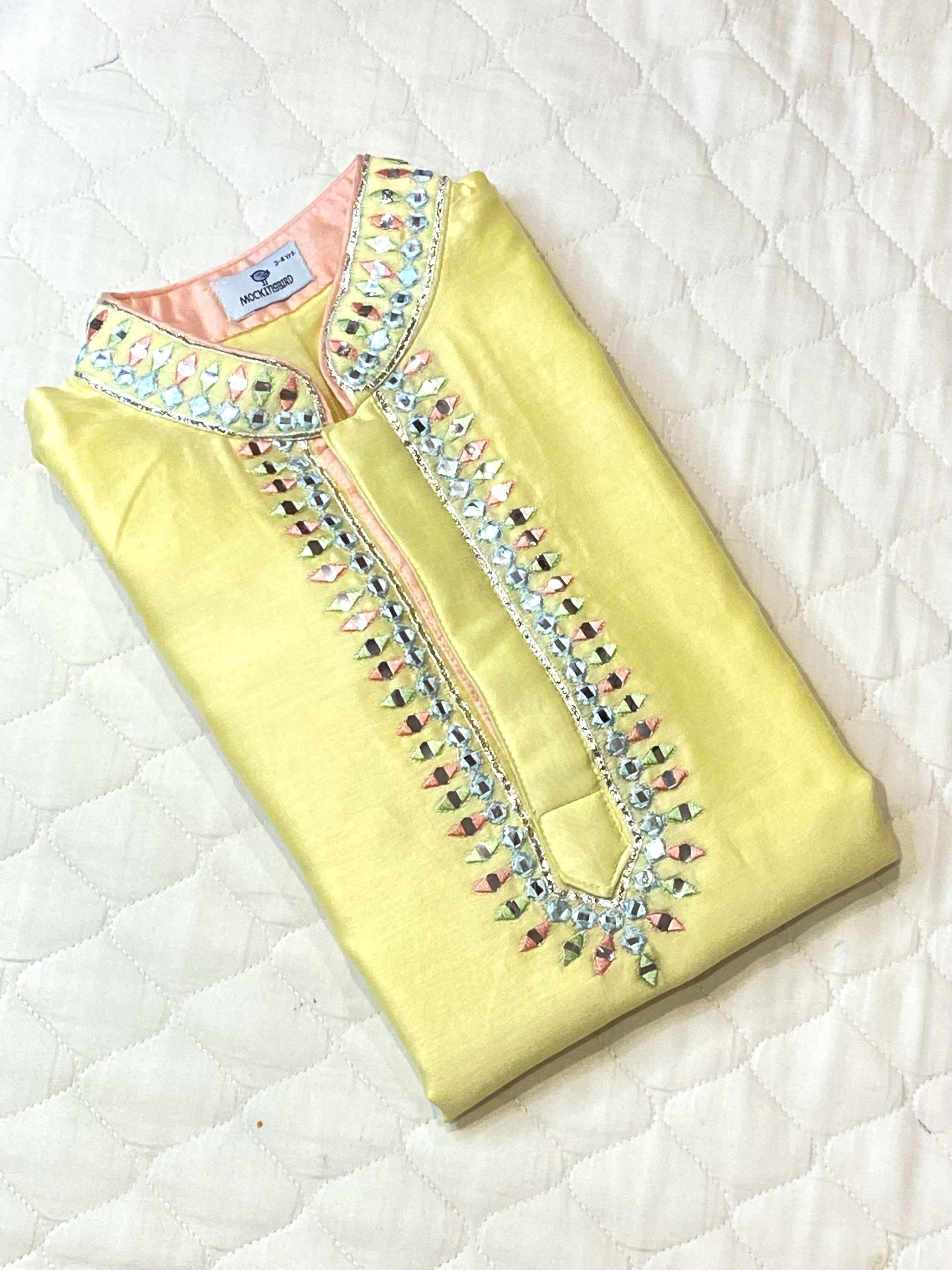 Lemon Yellow Kurta with Resham and Mirror Work & Ivory Pyjama