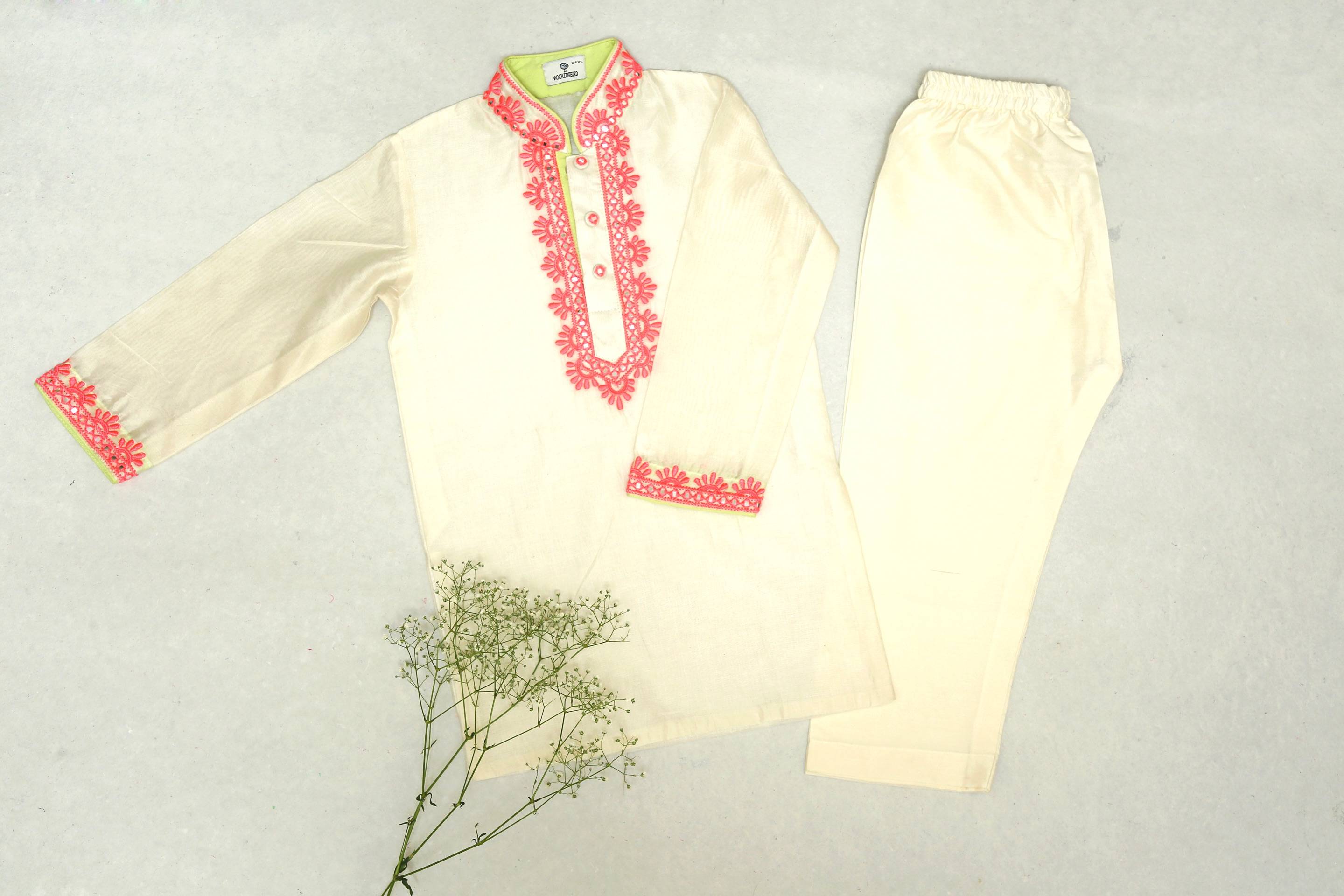 Ivory Kurta with Pink Resham Work with Ivory Pyjama