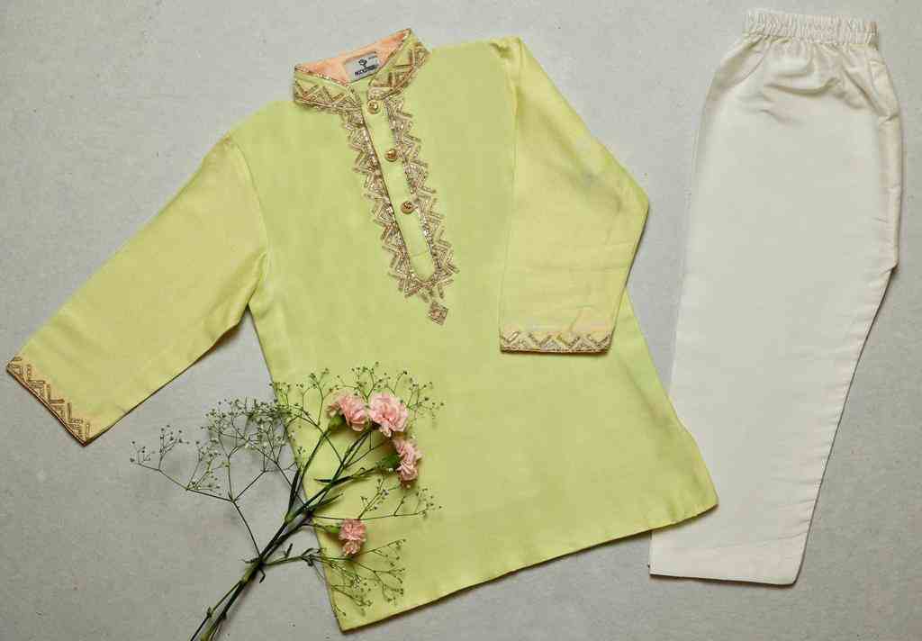 Lime Green Kurta With Gota Work & Ivory Pyjama