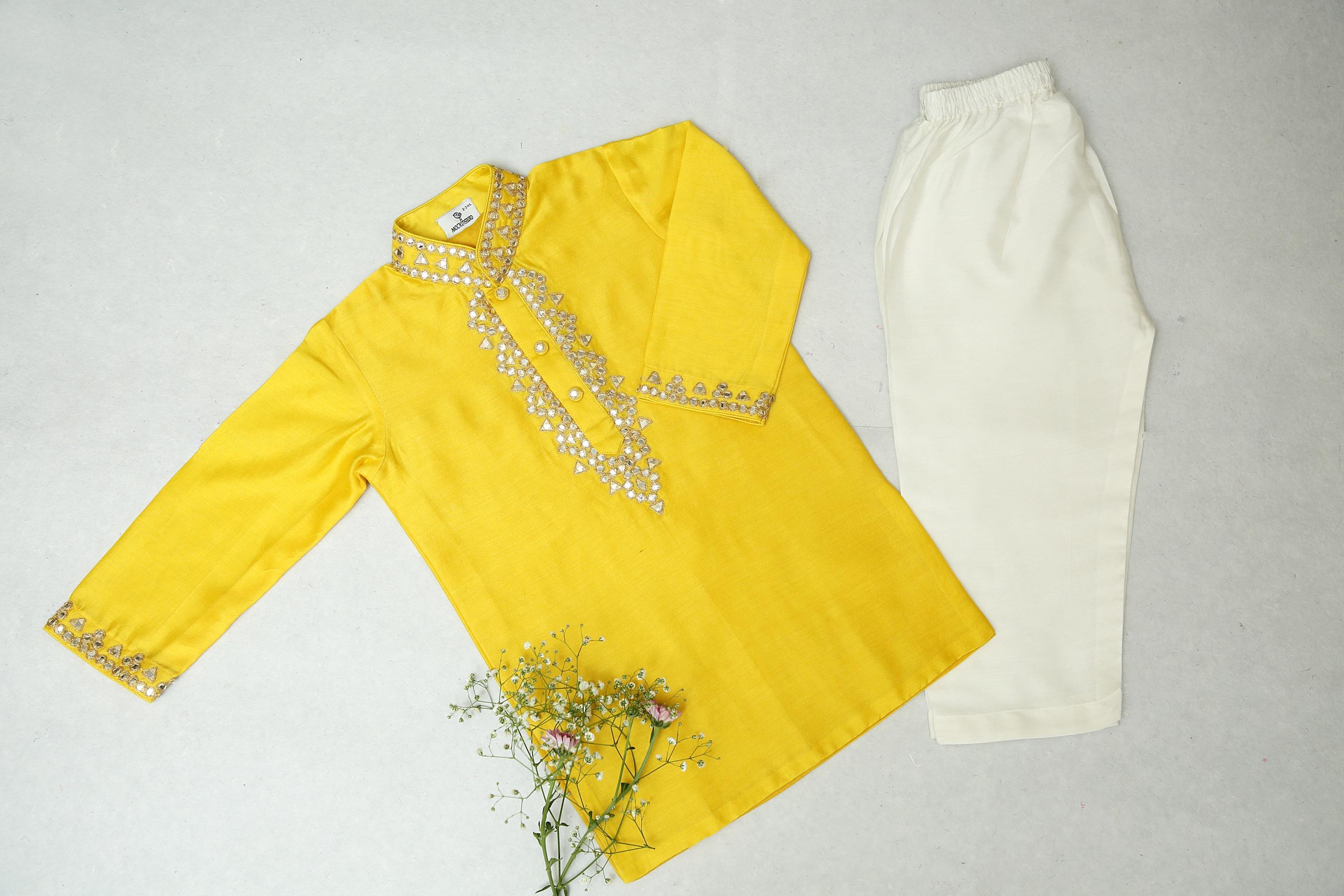 Chrome Yellow Kurta With Mirror Work & Ivory Pyjama