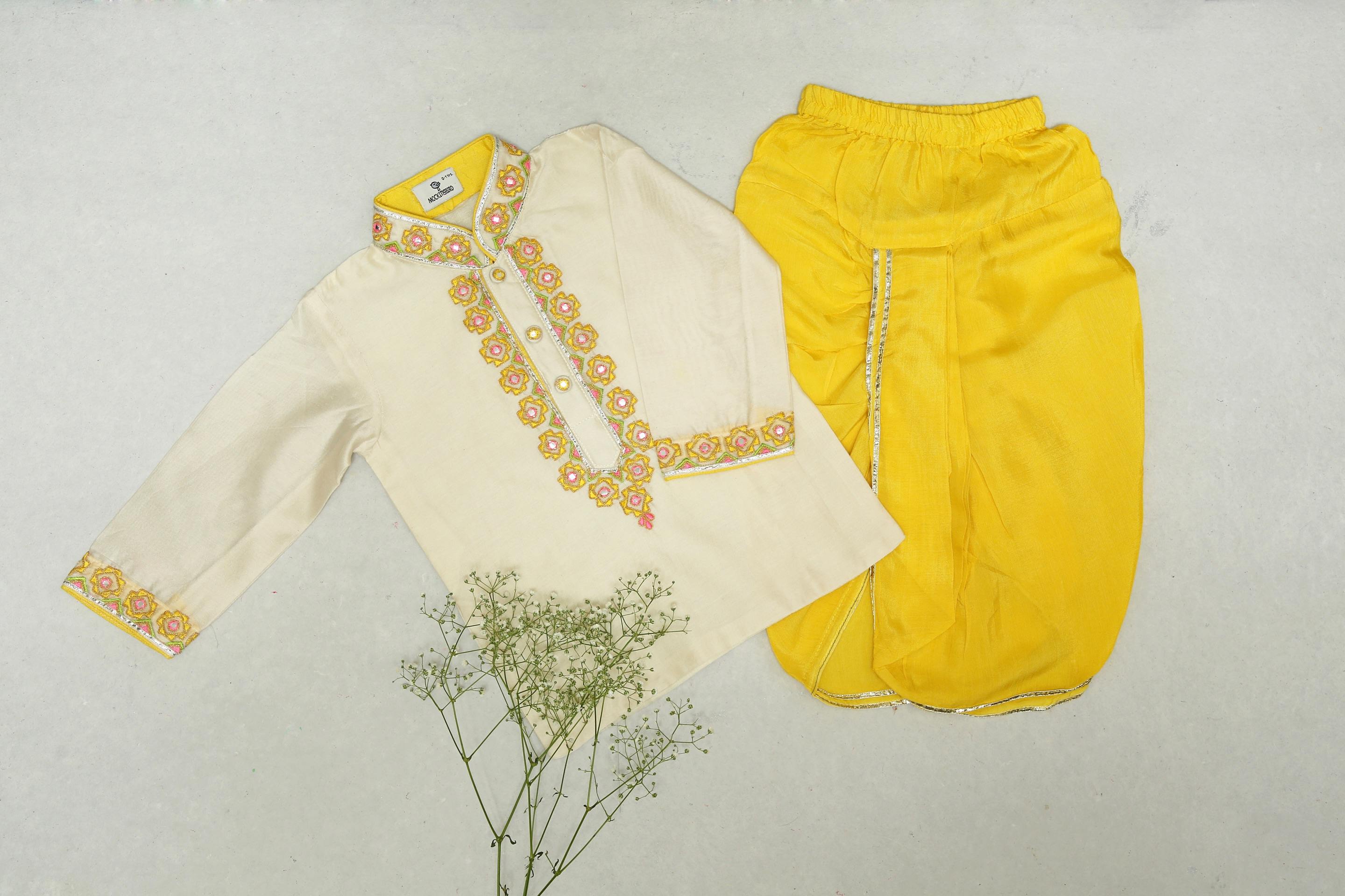 Ivory kurta and Yellow Dhoti