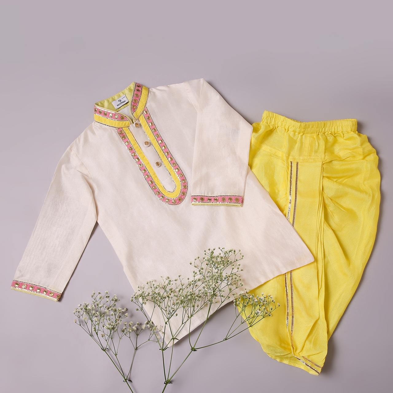 IVORY KURTA WITH PINK /YELLOW PATCH WITH GOTA WORK AND YELLOW DHOTI